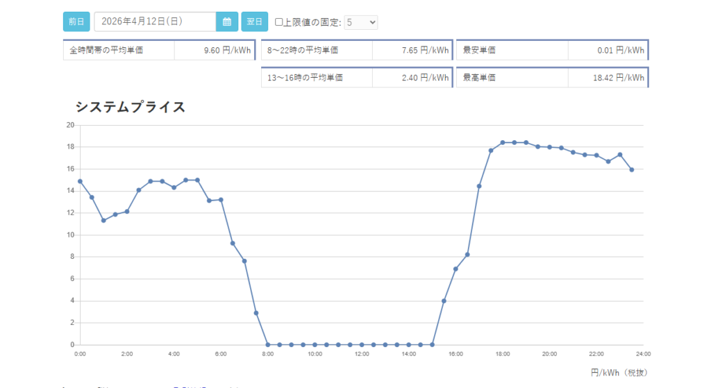 この日は平均9.6円/kWhで、最安値は8時~15時の間の「0.01円」です。最高値は18.42円/kWhとなっています。