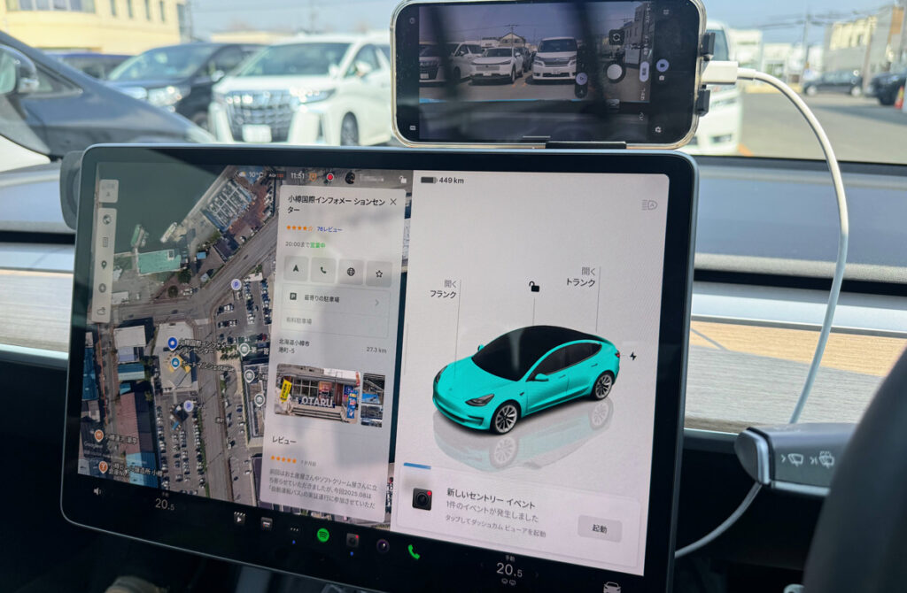 とりあえず、札幌市のドン・キホーテに寄って、携帯電話マウンタを購入して設置しました。(※羽田に駐車したテスラからマウンタを持ってくるのを忘れました・・・)