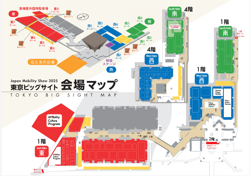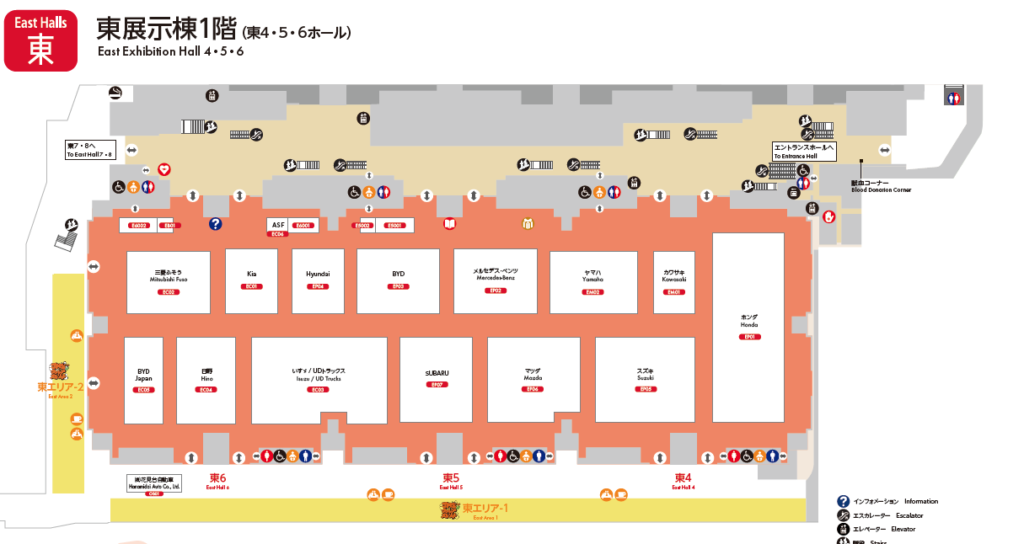 自動車メーカーが、東エリアと西・南エリアに分かれてしまって居ます。最も自動車メーカーが多く集まるのが東エリアになっています。主要メーカーを以下のようにまとめました(太字はおすすめ)。PDF版のマップは以下のリンクこちらから!(JAPAN MOBILITY SHOW MAP:PDF)