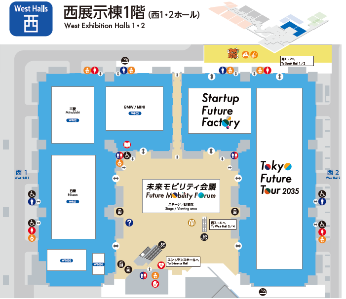 公共交通機関できた場合、2Fの中央ゲートから入ります。そのため、西1エリアから回りはじめるのが最適です。西1Fにおりるエスカレーターを降りてすぐ左方向に行けば「NISSAN」自動車からはじまり、三菱、BMWと見て、Startup Future Factoryを回ります。ここには優良な中小企業や大学が、新しいアイデアでモビリティの世界への貢献を展示しています。Tokyo Future Tour2035では、10年後の未来を想定した展示が行われています。