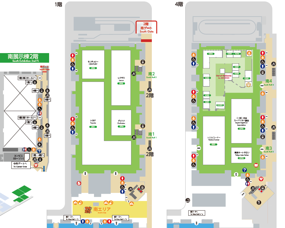 南展示場は1Fはトヨタのエリアです。トヨタ→センチュリー→レクサス→ダイハツと周り、ダイハツ先の出口から、南4Fに行くエスカレーターに乗ります。4Fでは、手前のスーパーカー協会、東京オートサロンを回って、屋上外に出るとキッチンカーのコーナーがあります。ここで休憩し、西4Fに行きます。