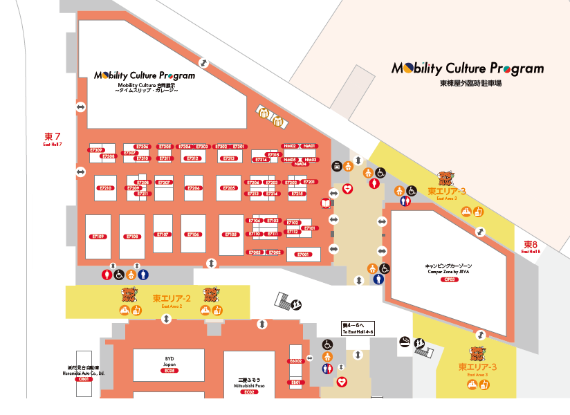 次に東館に向かいます。途中に、トイレやコンビニ、コインロッカーなどがあるため、用事がある場合はここで済ませて東に向かいます。東は4・5・6エリアに入ってから、東7・8エリアを通り、またその帰りにも東4・5・6を通って中央ゲートに戻ると良いでしょう。東4・5・6エリアの外にもキッチンカーが沢山あるため、調査を終えたひと休みや資料のまとめなどもここで行えます。