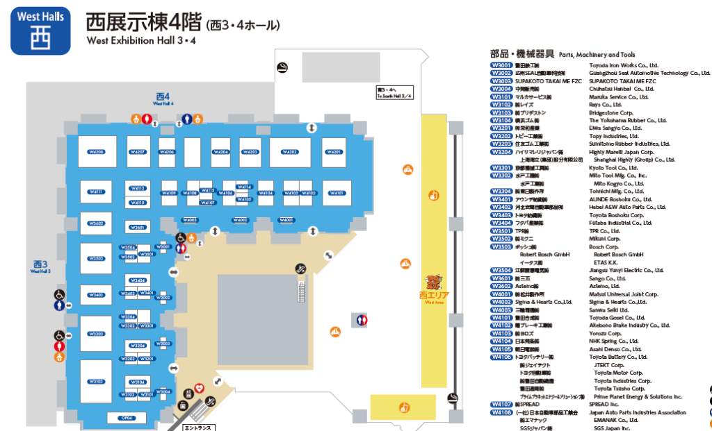 西4Fは自動車部品メーカーが中心です。南から回ると地図の右手側から入ってきますので、徐々に左に移動して、最後は地図左下のタイヤメーカーのコーナーを経て1Fエンタランスに向かうエスカレーターに出ます。実はビジネスの場合は西館が一番情報収集に時間がかかるかもしれません。