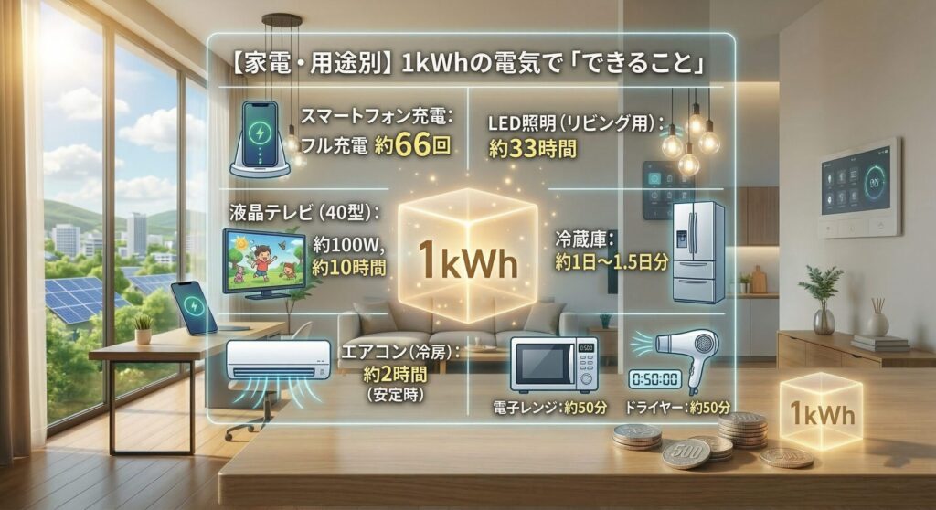 では、この約31円で買える「1kWh」の電気を使って、私たちの生活で具体的に何ができるのでしょうか?身近な家電で比較してみましょう。